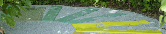 Die Regenbogen-Brücke soll den Kindern ein Bewusstsein für ihre bunte Gefühlswelt geben. Es soll sie daran erinnern, dass auch sie einen bunten Regenbogen in sich tragen. Dieser führt sie auch in unsicheren Zeiten immer wieder auf den rechten Weg. Daher beginnt der Regenbogen in unserem Fall direkt am Pilgerweg, führt dann durch ein vorher unwegsames Gelände und endet dann wieder auf dem selbigen. Die einzelnen Stufen haben unterschiedliche Abstände zu einander. Manchmal muss man eine große Lücke überwinden und manchmal sind die Platten dicht aneinander. Auch in wahren Leben verlaufen manche Pfade nicht gradlinig und bequem. Zuweilen muss man Mut und Vertrauen haben, dass der nächste sichere Schritt gelingt. Daran erinnert dieser Regenbogen. Die Begriffe auf den einzelnen Regenbogenstreifen geben eine Orientierung, wie die Kinder die Farben empfinden.