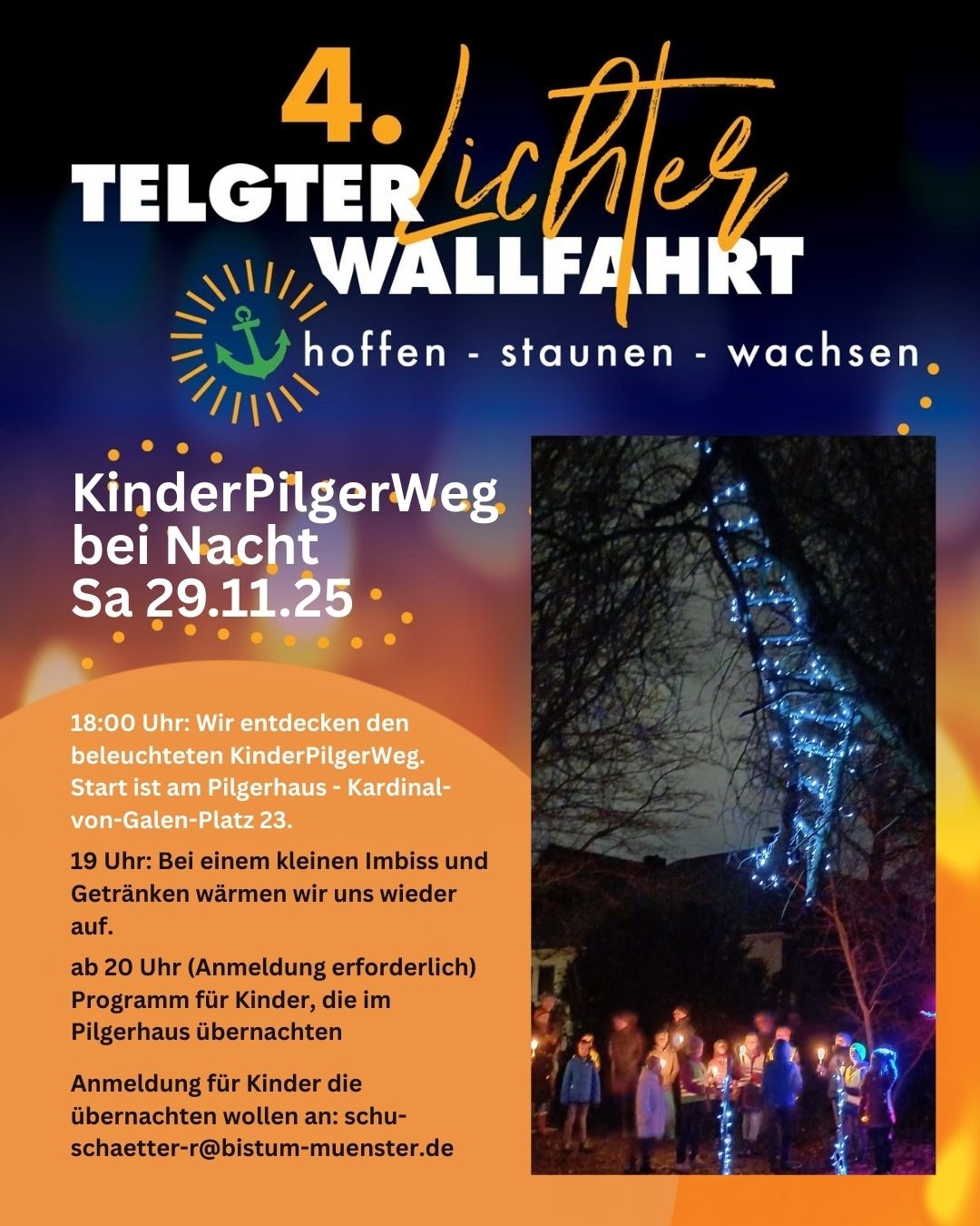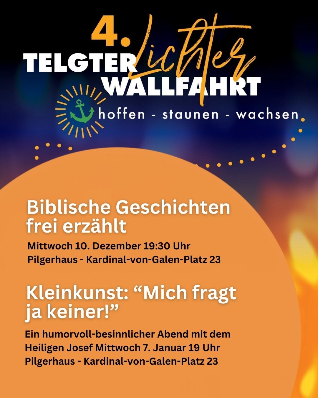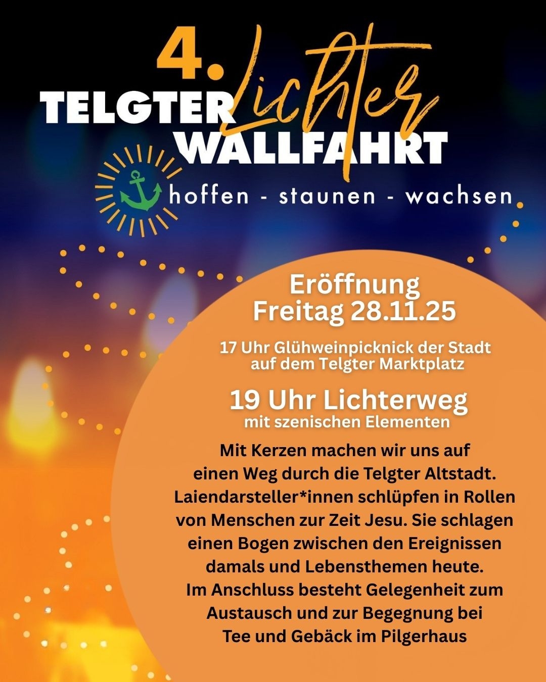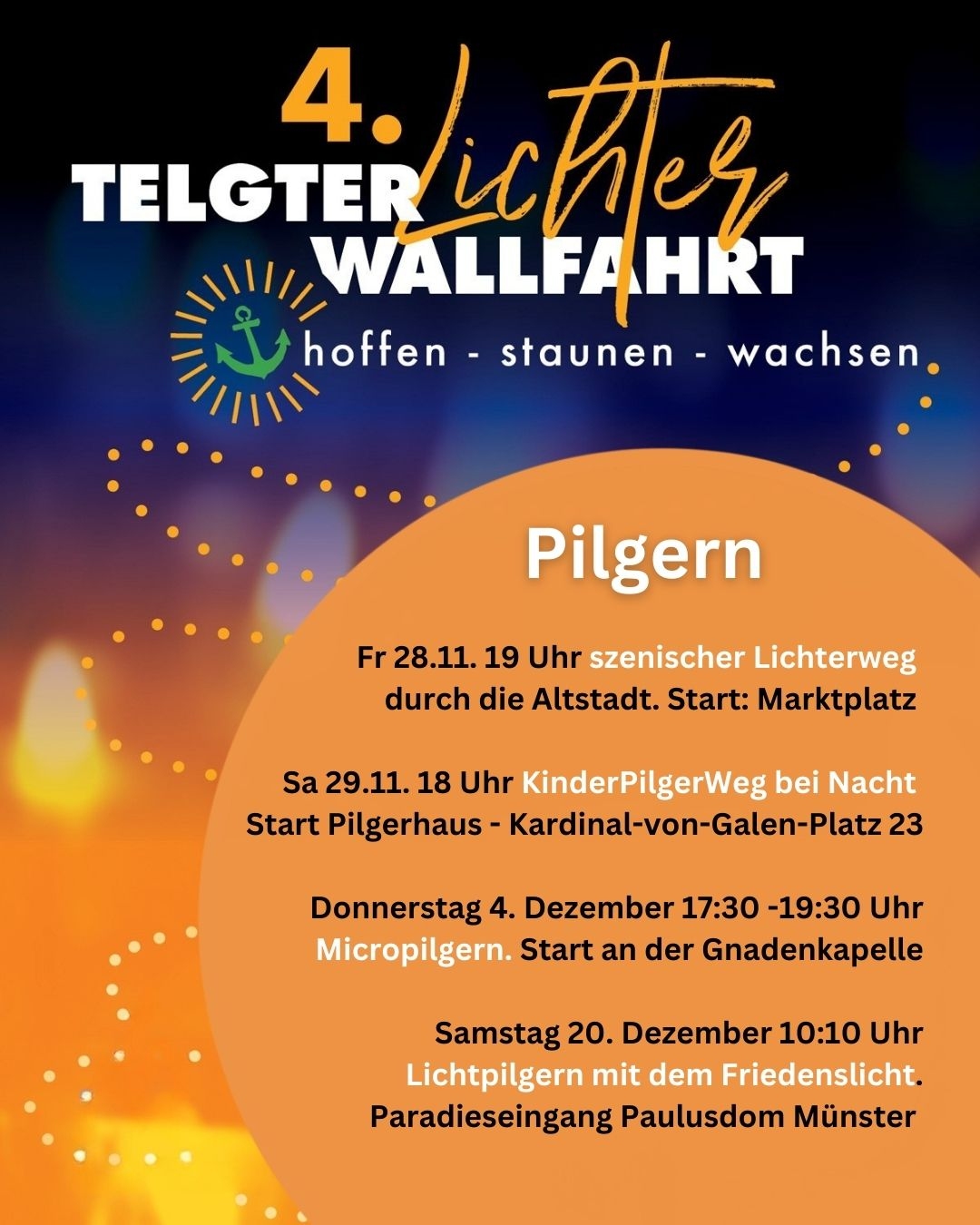 hoffen - staunen - wachsen Unter diesem Leitwort laden wir zur 4. Telgter Lichterwallfahrt ein. Mit berührenden Gottesdiensten und vielfältigen spirituellen Aktionen vom 28. November 2025 bis zum 11. Januar 2026.