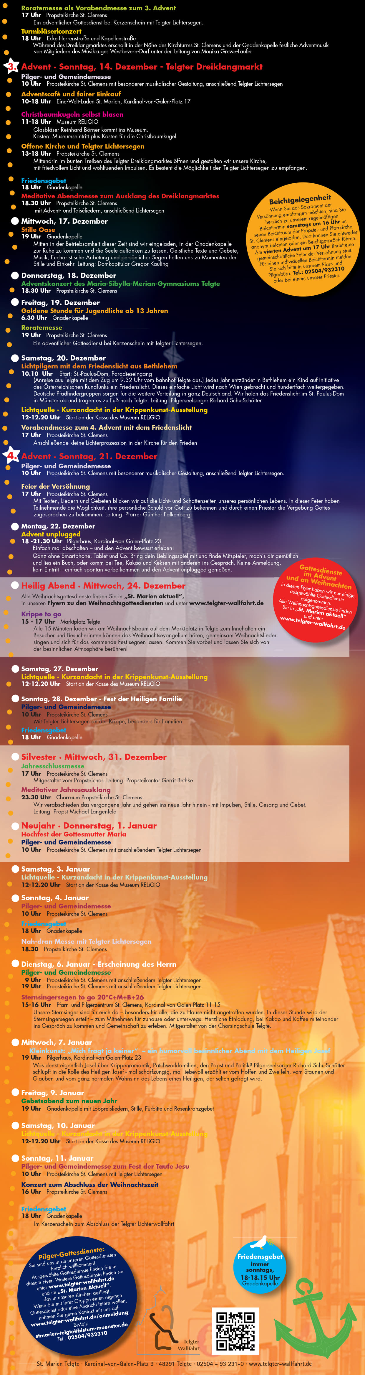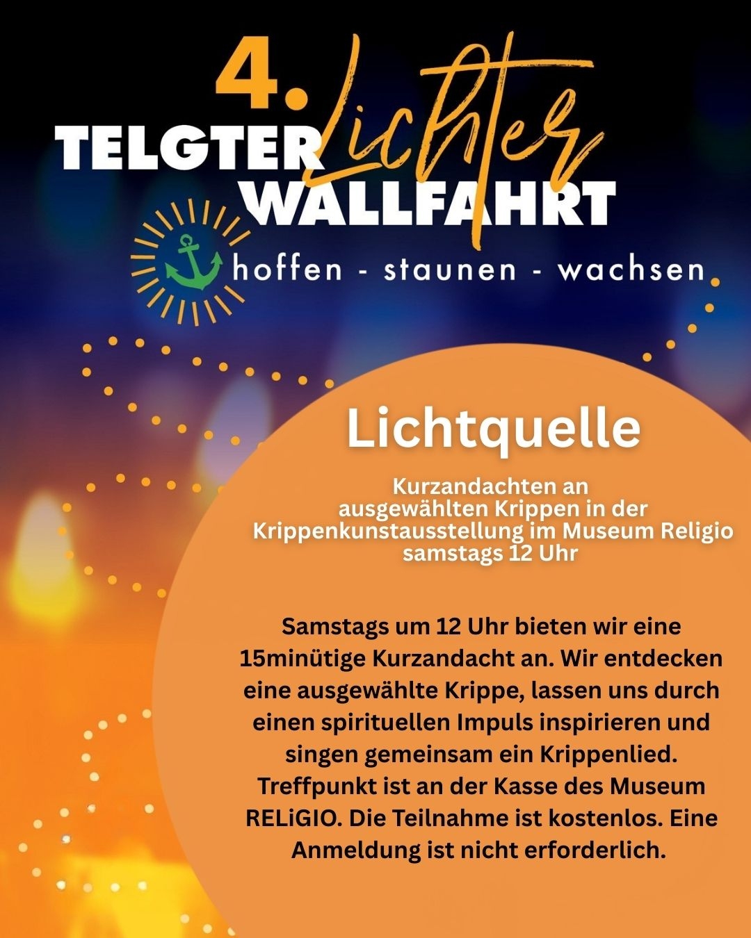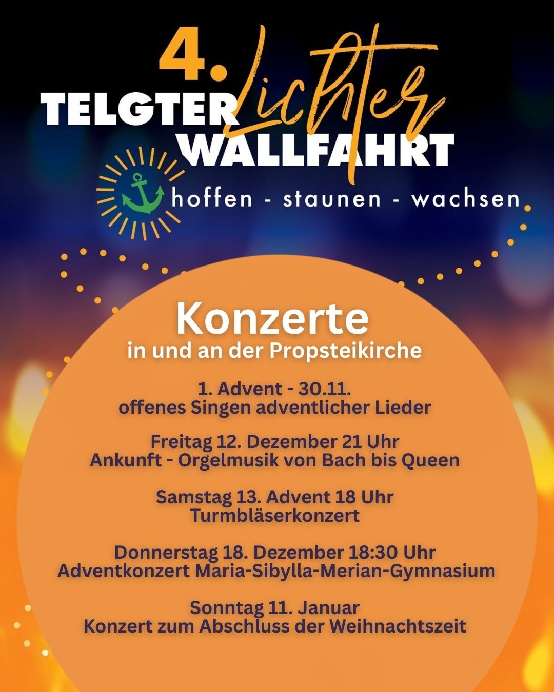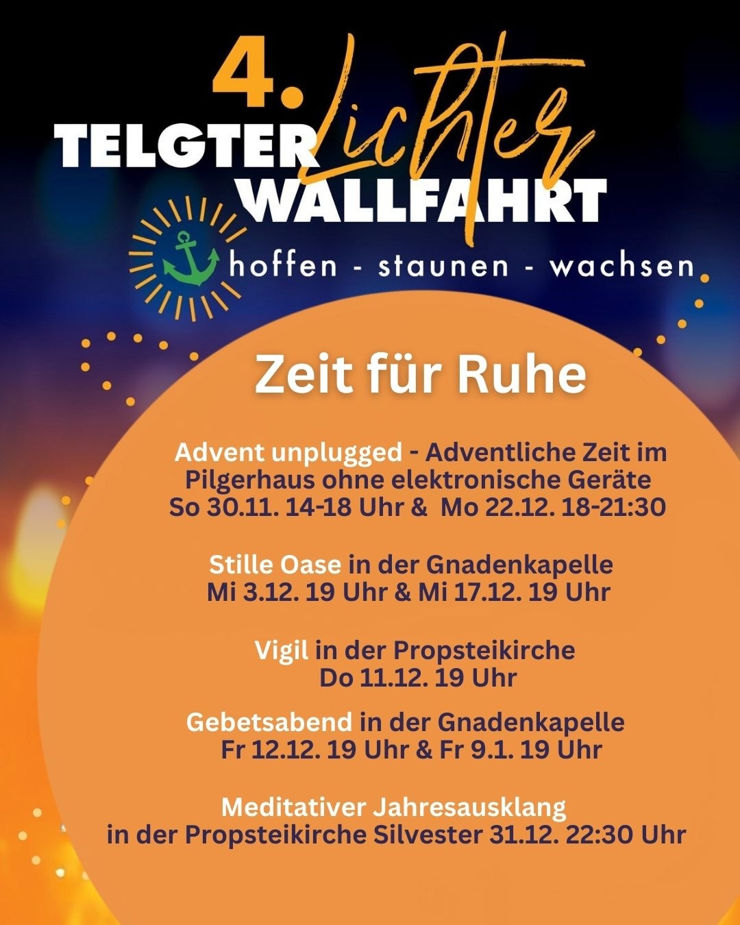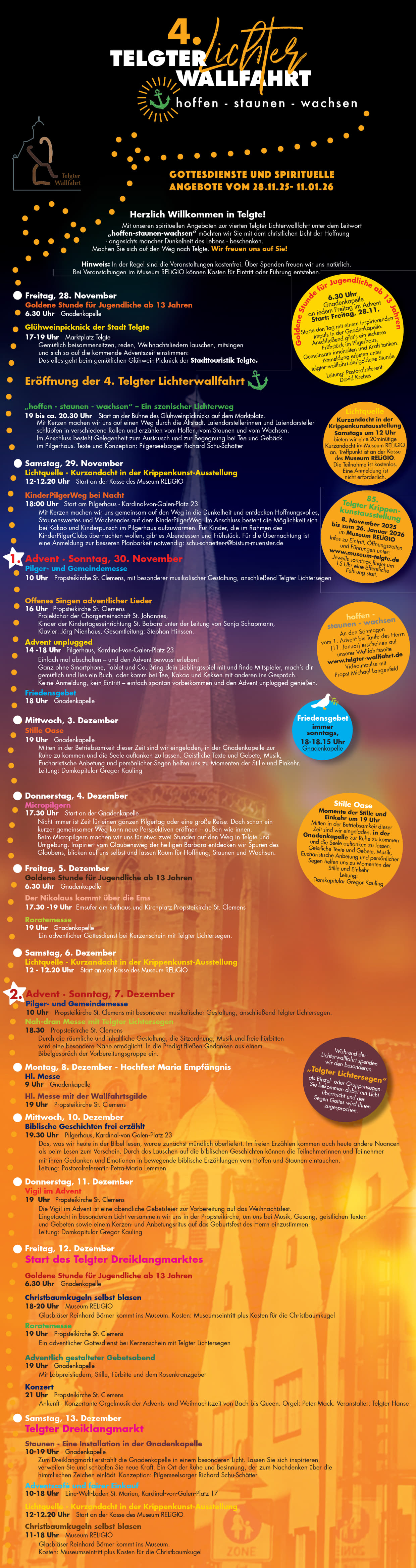 hoffen - staunen - wachsen Unter diesem Leitwort laden wir zur 4. Telgter Lichterwallfahrt ein. Mit berührenden Gottesdiensten und vielfältigen spirituellen Aktionen vom 28. November 2025 bis zum 11. Januar 2026.