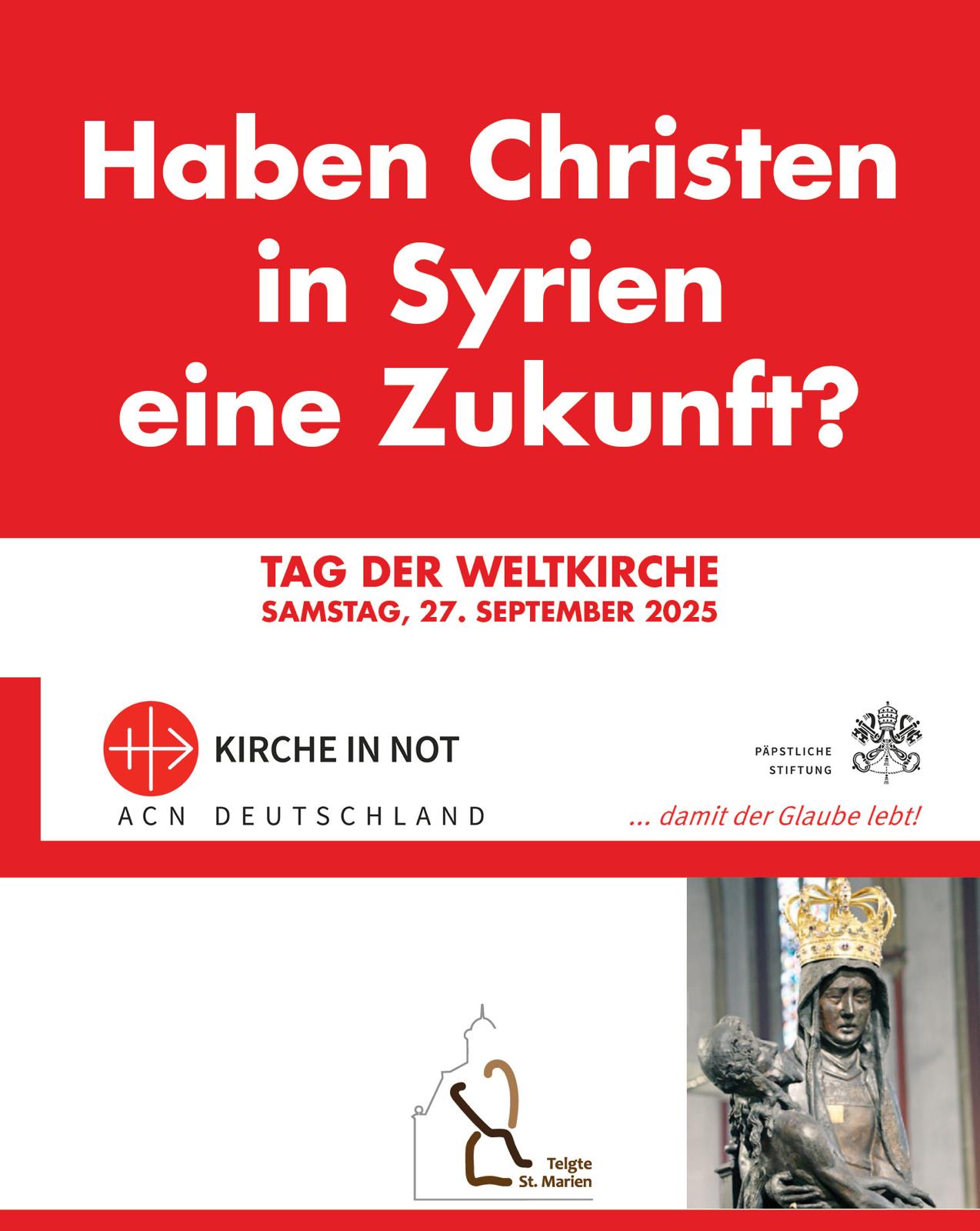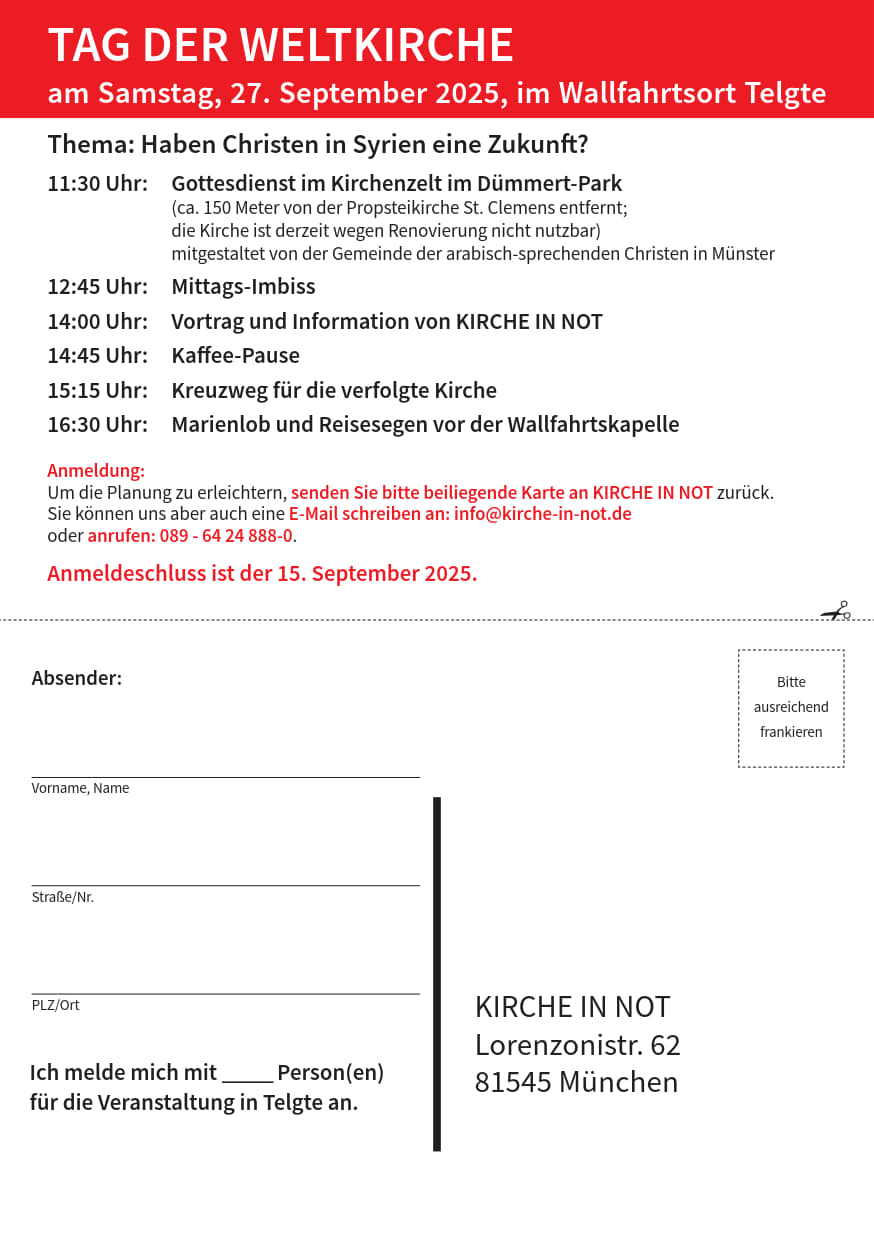 Am Samstag, 27. September, lädt KIRCHE IN NOT zu einem Gebets- und Informationstag in den Wallfahrtsort Telgte bei Münster. Themenschwerpunkt ist in diesem Jahr die Situation der Christen in Syrien. Die heilige Messe zum Beginn des Tages wird um 11:30 Uhr mitgestaltet von der Gemeinde der arabischsprechenden Christen in Münster. Ein syrischer Christ wird ein persönliches Zeugnis geben.